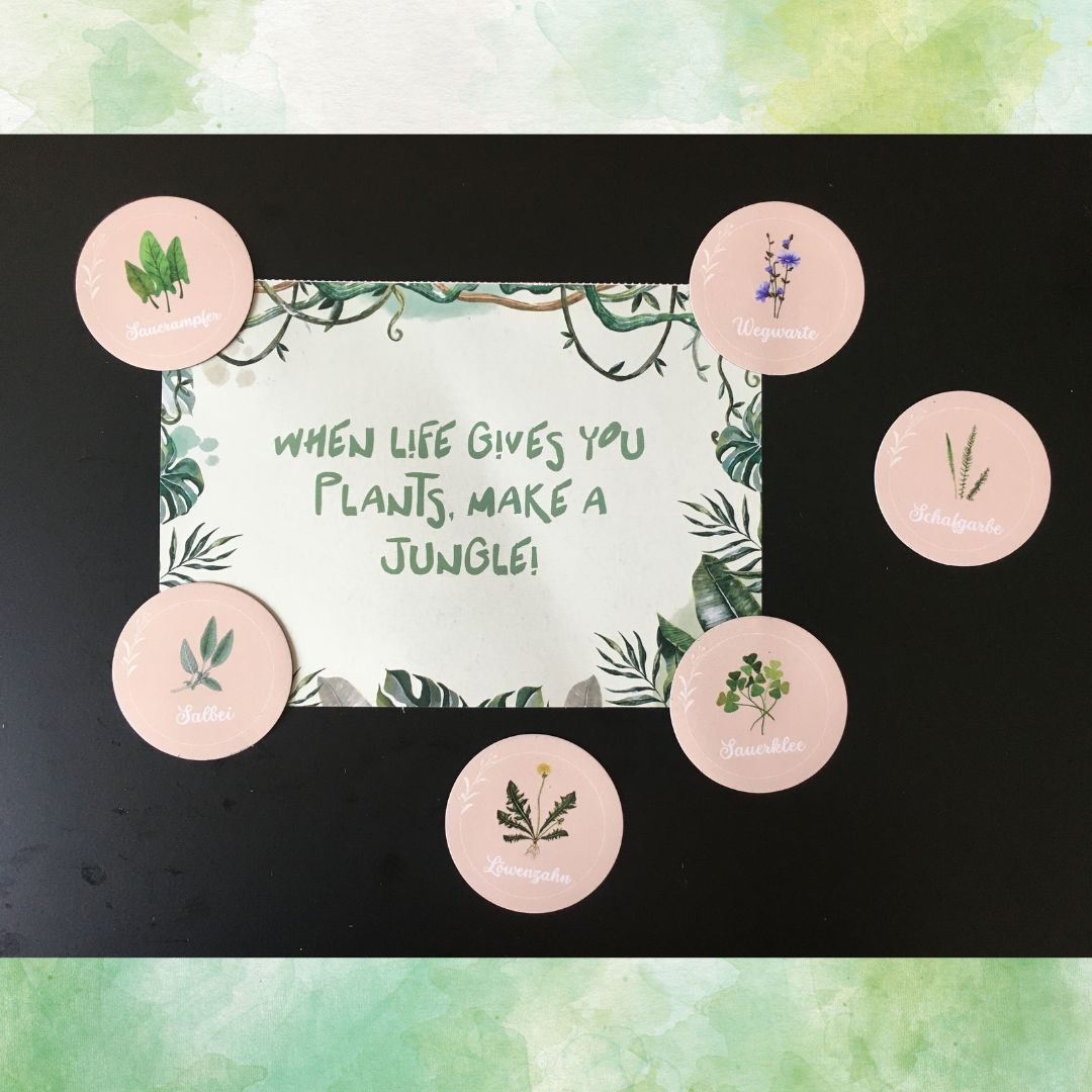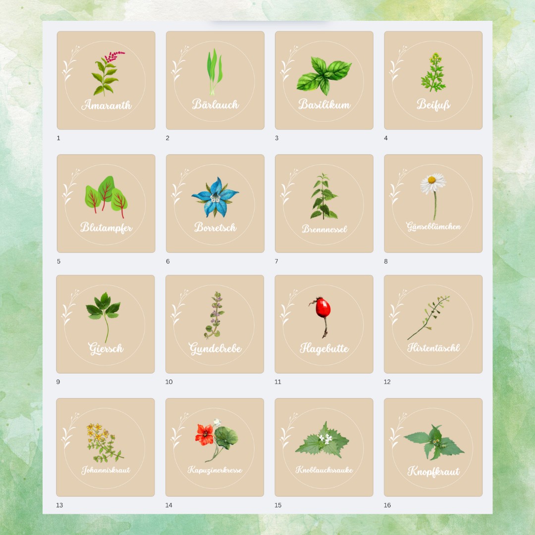 Bei der Bestellung schreibst du in den „Kommentar“ die Nummern der 6 Wildkrautmotive.